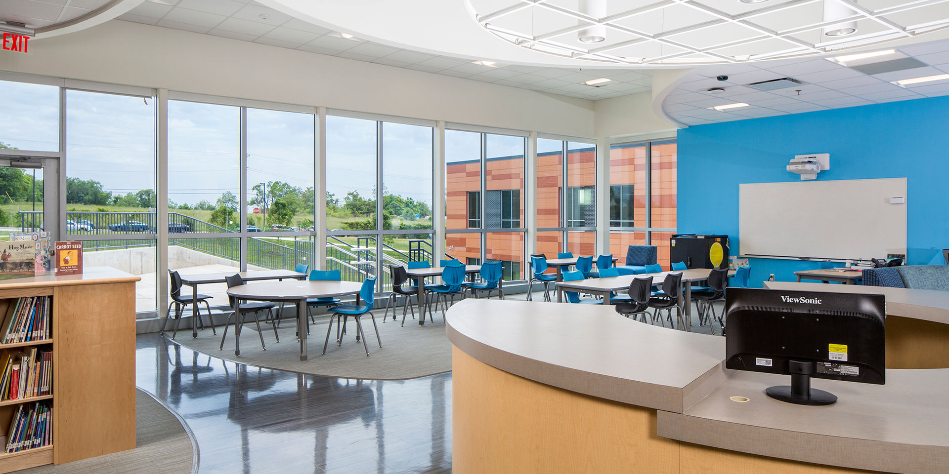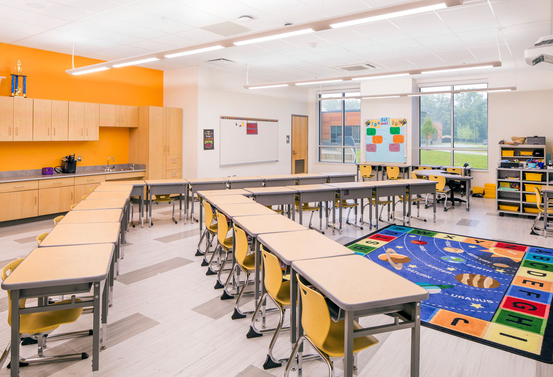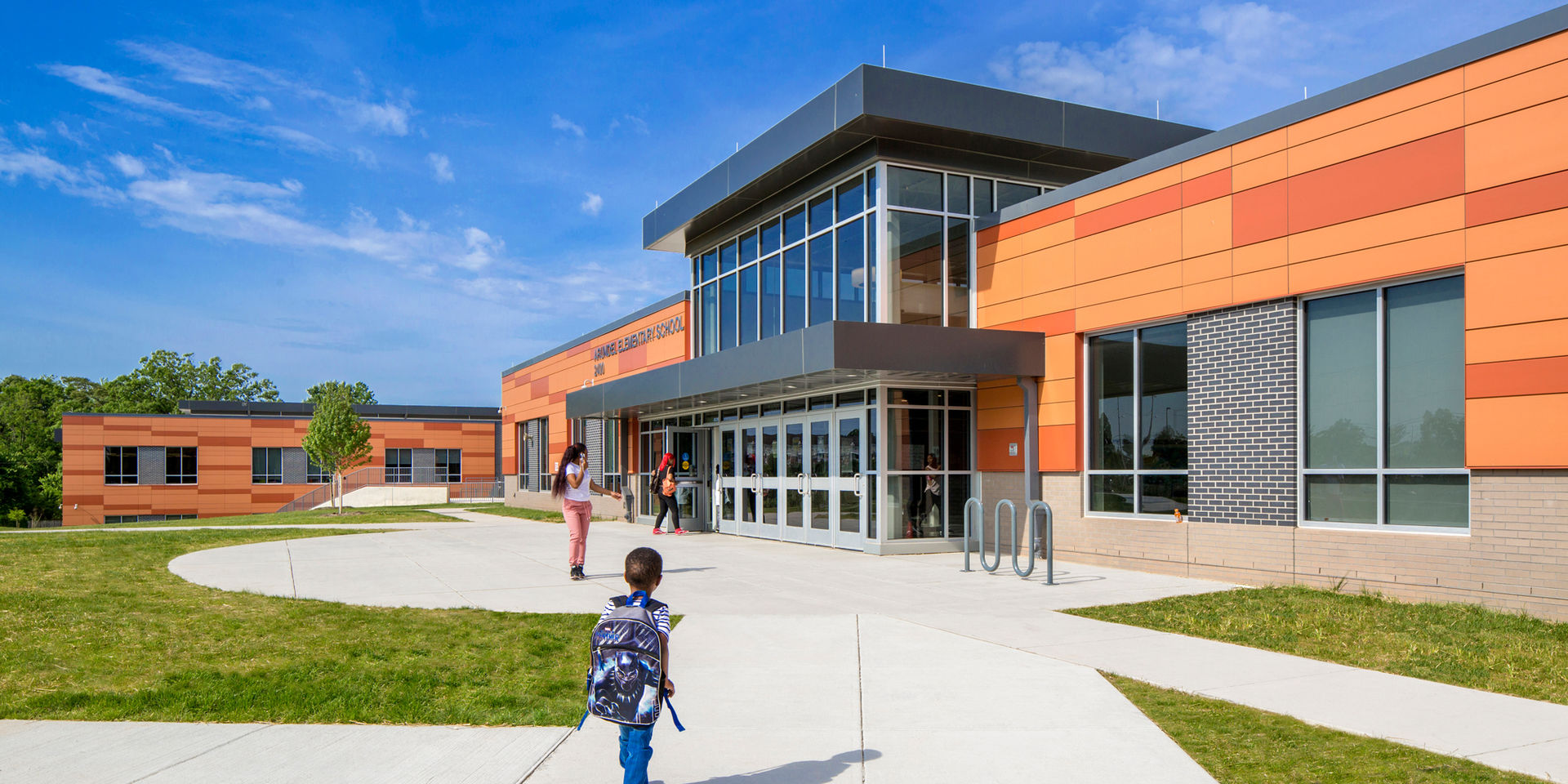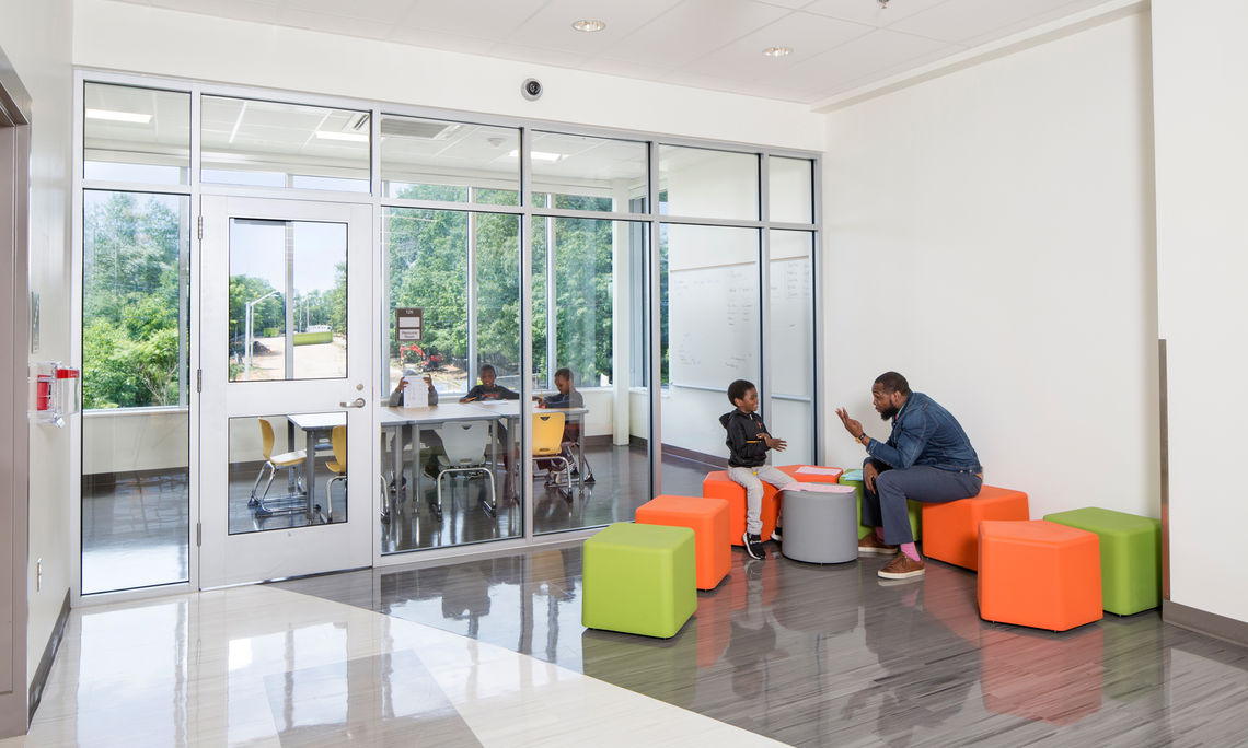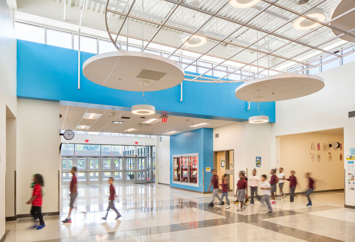 The school and landscape are broken down into a series of zones to guide the children’s increasing comfort level. As users approach from the street and ascend to the school entrance, their excitement builds as they pass outdoor classrooms and learning spaces. Upon entering the building, shared spaces are centrally located and depictive of a living room in a child’s home. The “classroom village”—likened to a bedroom—is the ultimate comfort zone where children can feel at ease and discover their own identity. Each grade has its own neighborhood and includes a centrally-located shared collaborative learning space and resource room.