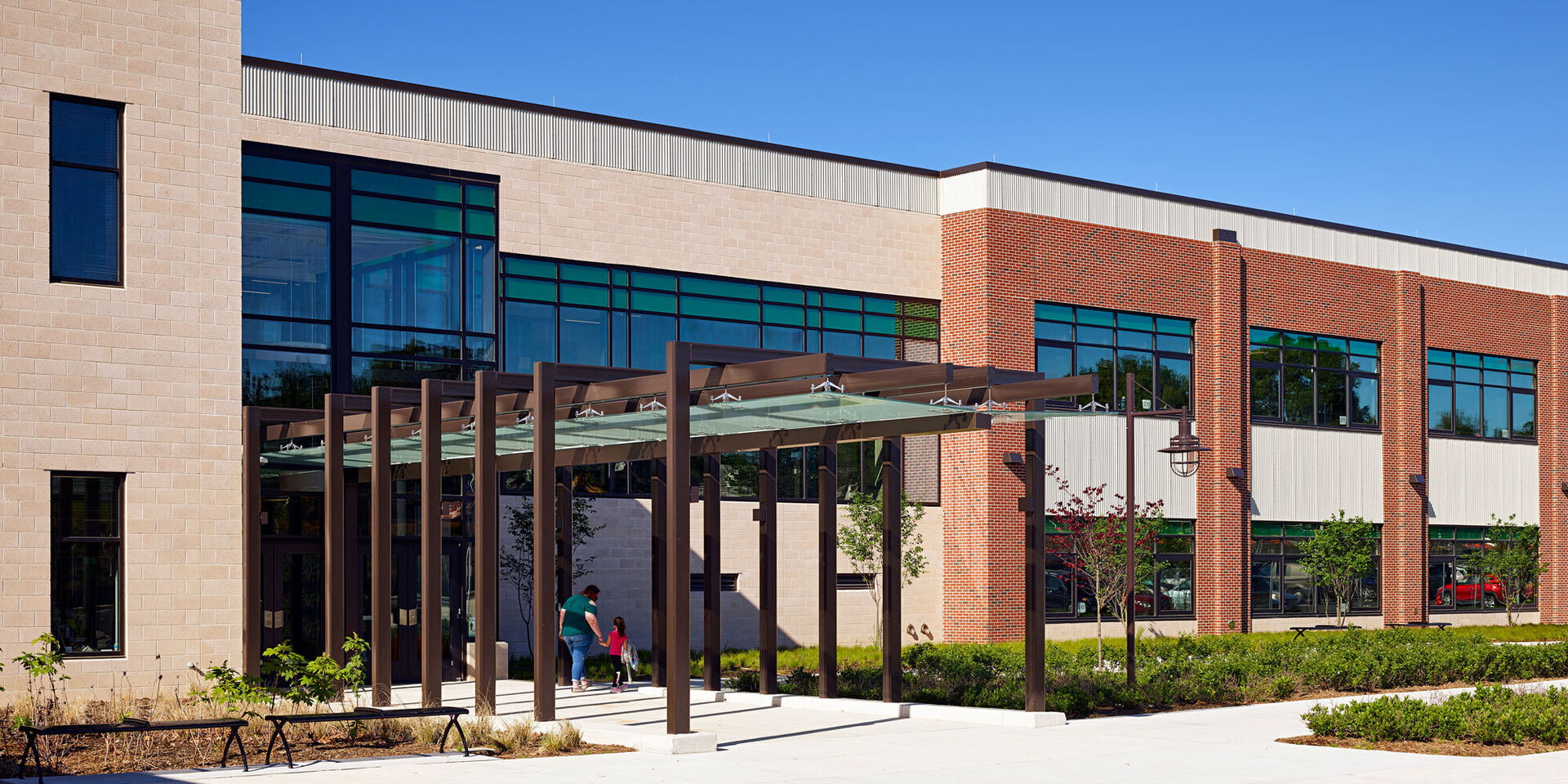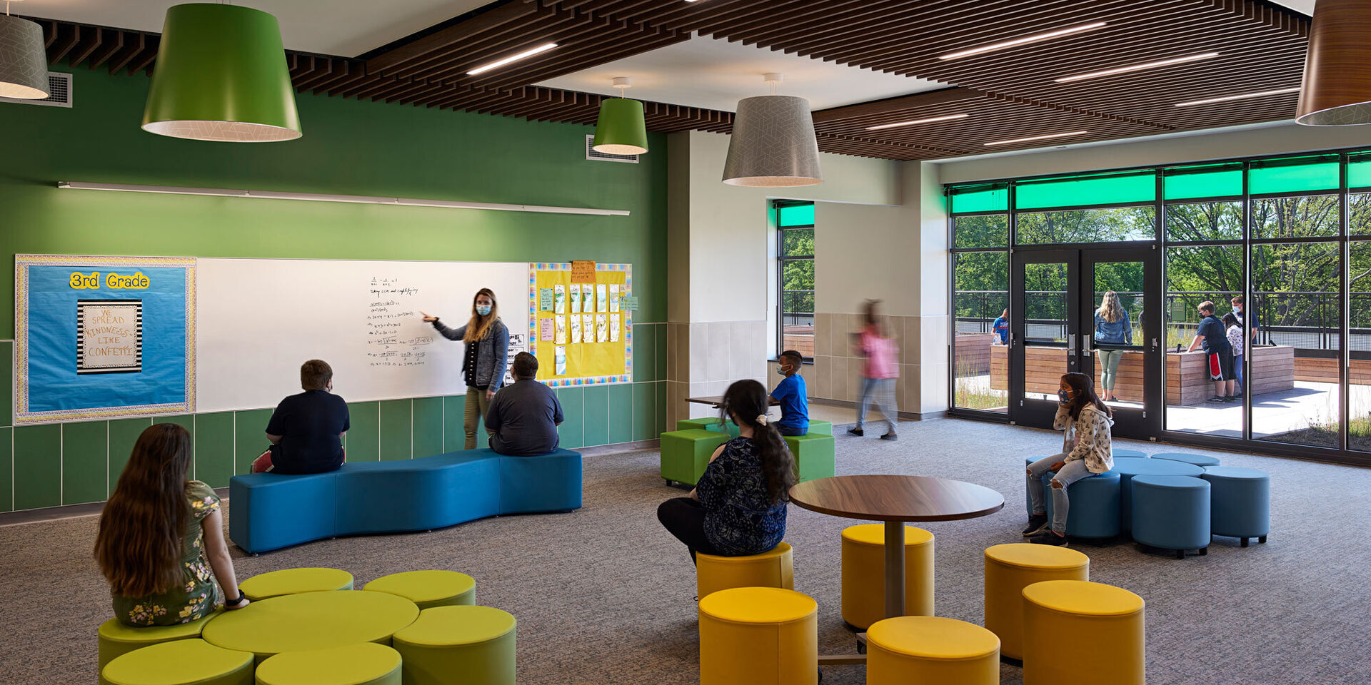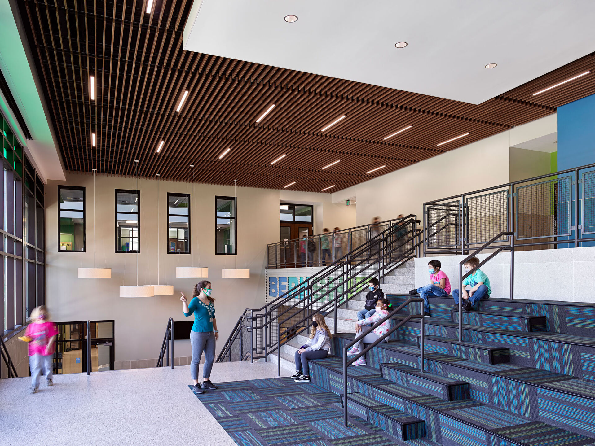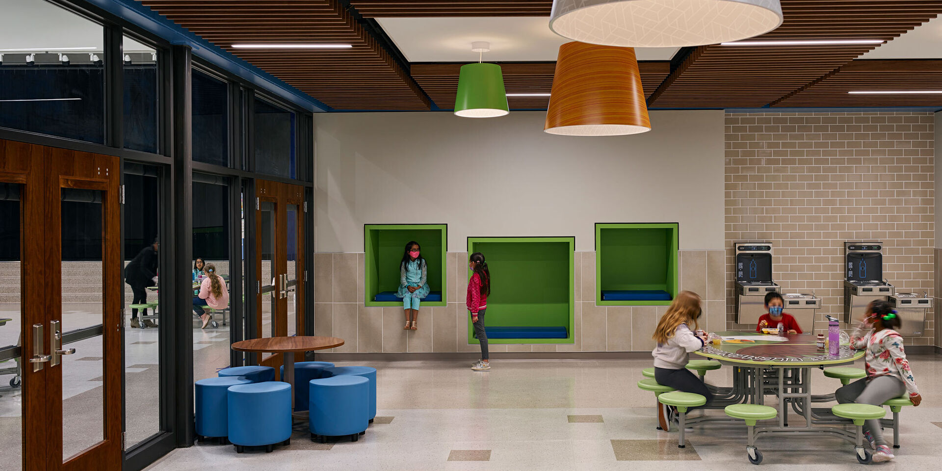 Comprised of a two-story classroom wing and a one-story cafeteria/gymnasium wing linked by a central core, the new school features a variety of interwoven collaboration spaces. A large learning commons with moveable furniture and writable wallcoverings accommodates multiple modalities and serves as the organizational element for each floor of the classroom wing. Pairs of classrooms share smaller breakout spaces for group and individual instruction. Circulation spaces are multi-functional, offering additional areas for informal learning. Students and teachers can gather on the main stair for presentations and performances that activate the central space. Underneath the stair, student creativity is on display through programmed pinup and teaching space for the art department.
