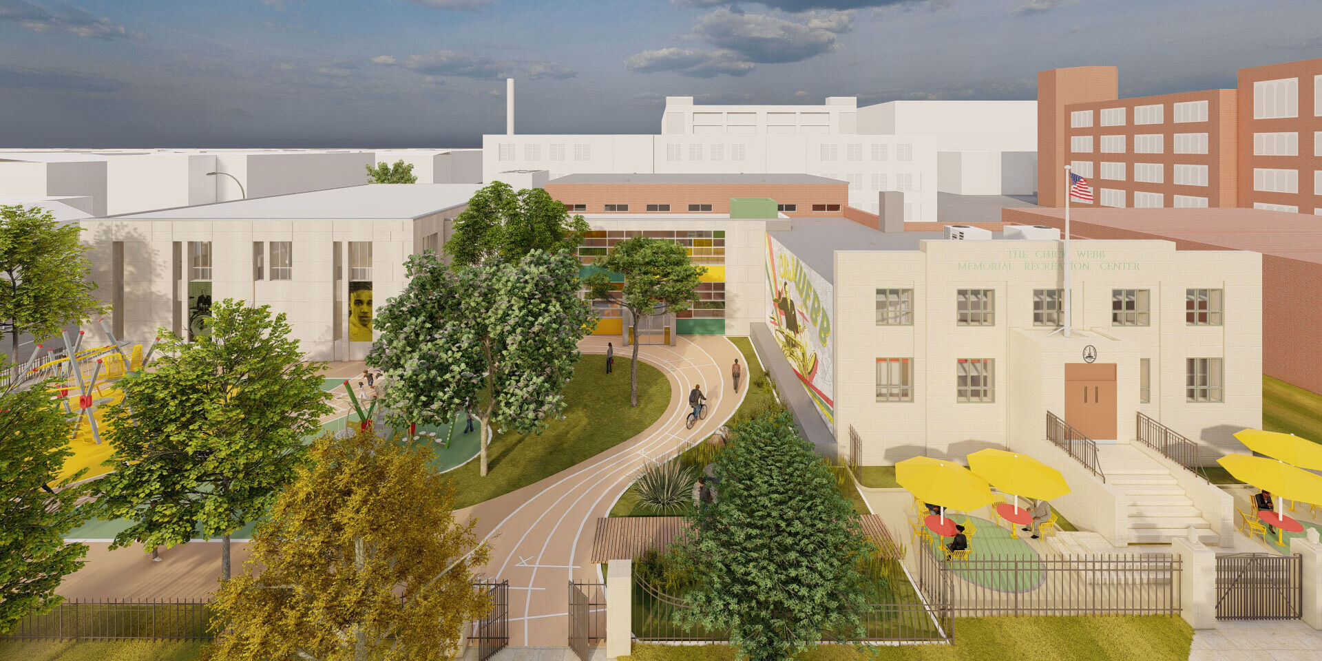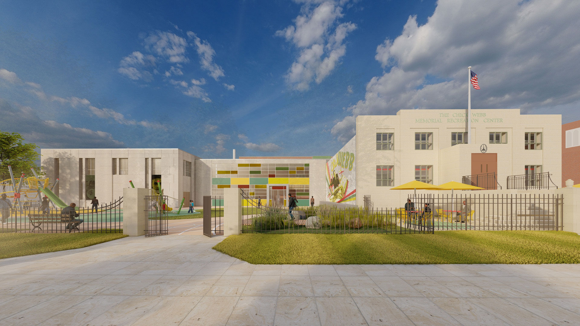 The new two-story addition is a “riff” on the architecture of the existing historic structure and a nod to the building’s legacy of jazz and Chick Webb. Modern limestone panels and fenestration complement and reflect the rhythm of the historic façade while the patterning of the entry’s glazing, inspired by Webb’s colorful drum sets, is reminiscent of a musical scale. Exhibits throughout the center document Chick Webb’s life and influence from his early upbringing in Baltimore to his legacy as leader of one of the most dominant swing bands.