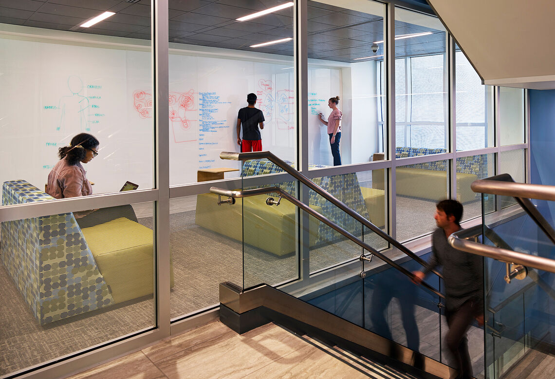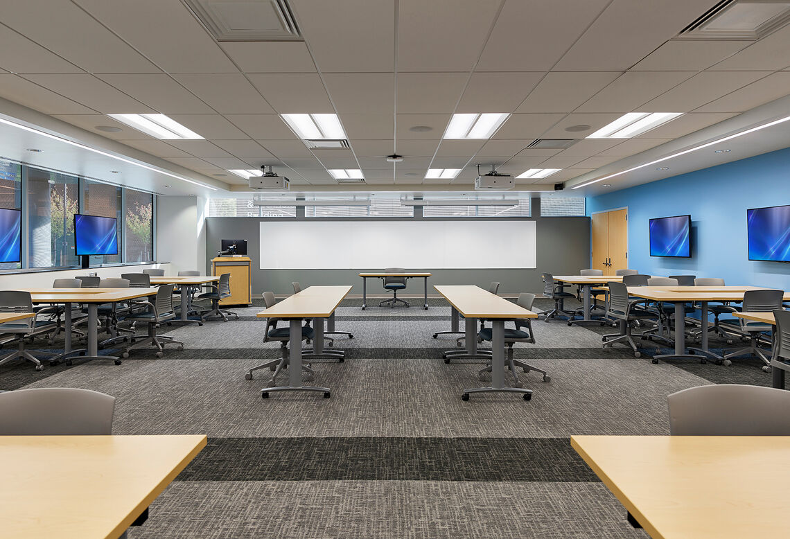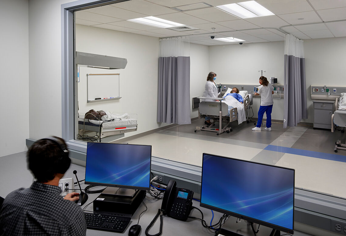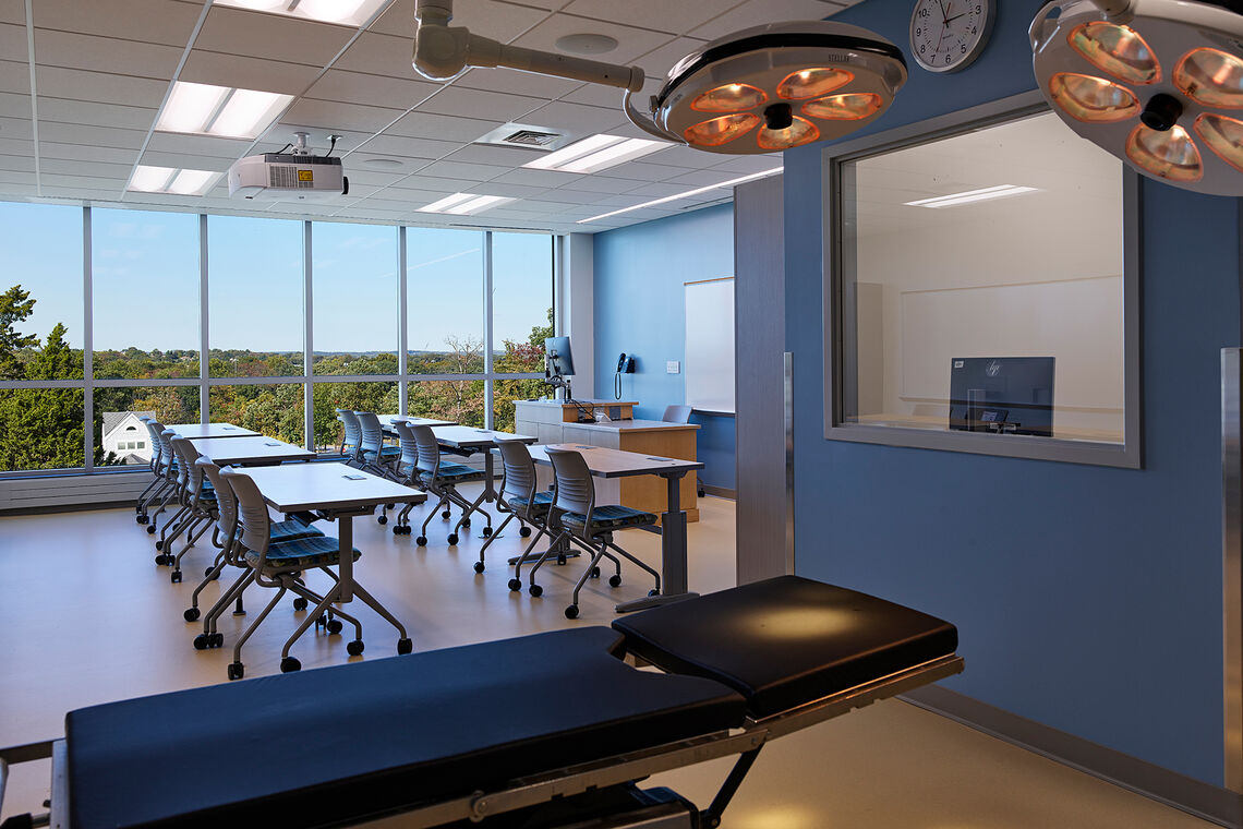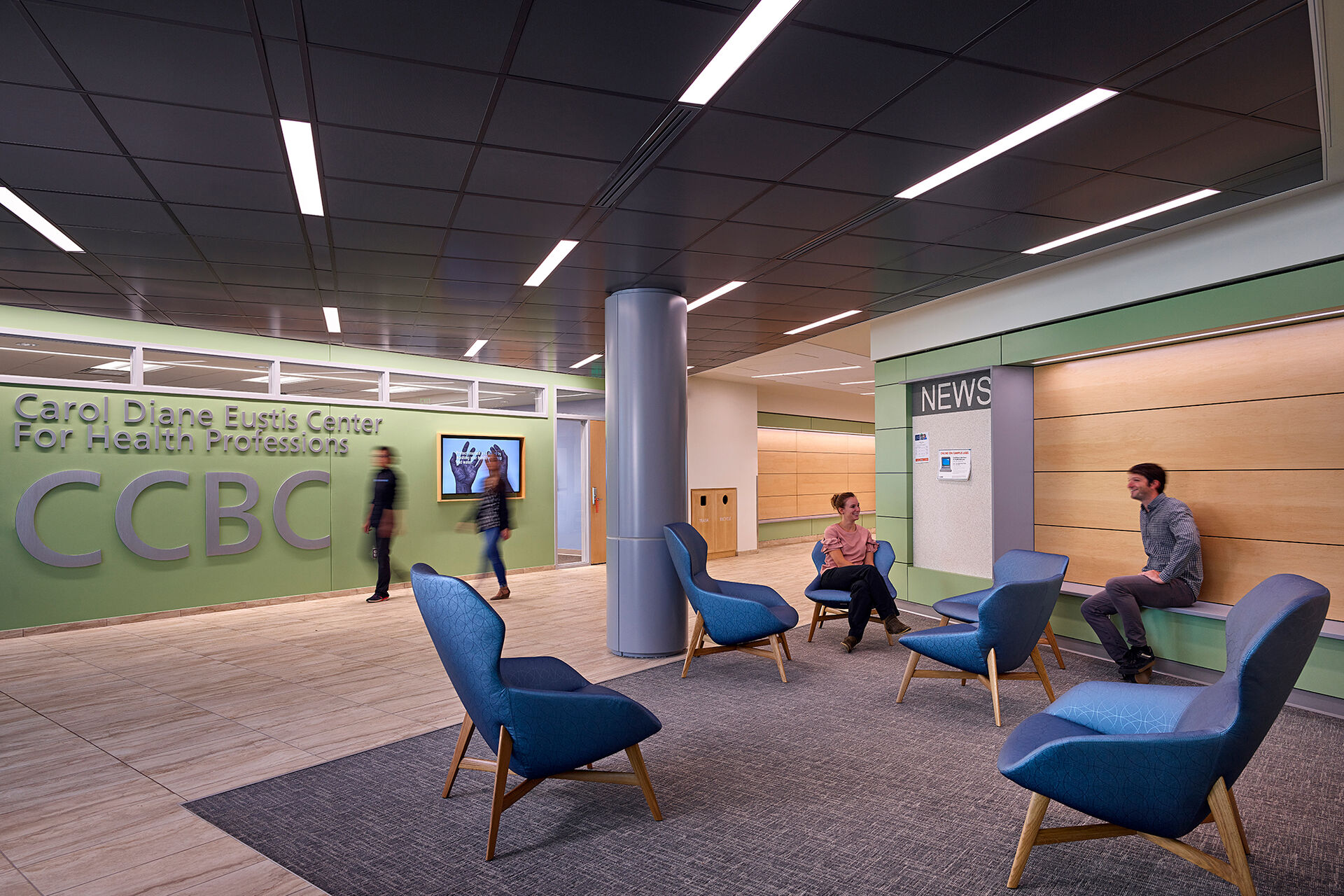 Housing multiple specialized career labs, the building accommodates the College’s Nursing, Respiratory Therapy, Medical Imaging, Radiation Therapy, Emergency Medical Technology, Physician Assistant, Massage Therapy, and Medical Laboratory Testing programs. Specialized spaces include an interdisciplinary simulation suite with computer-controlled manikins that can model patient conditions and with spaces that can mimic various clinical environments, including emergency room, hospital patient rooms, and exam rooms; a home environment simulation lab for “real world” emergency response practice; debriefing rooms for students to view colleagues in simulation labs or their own performance; an Academic Conference Center with adaptable layouts for team-based learning with instructor-led broadcast capabilities; areas for supplemental instruction or individual and group study; and faculty offices.