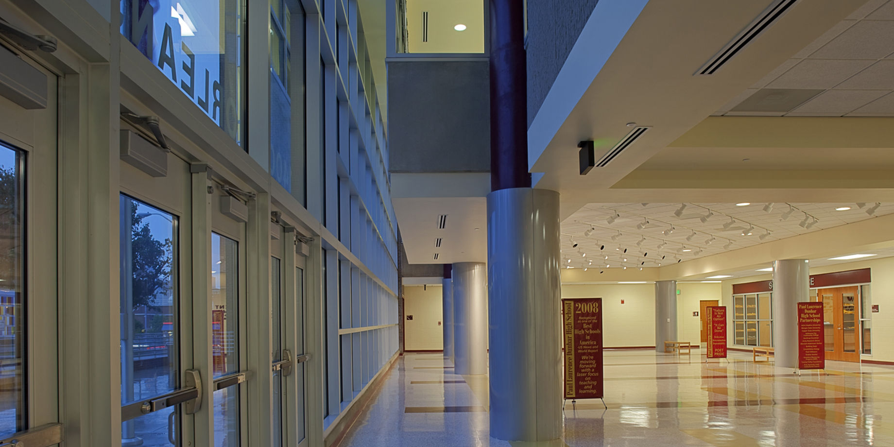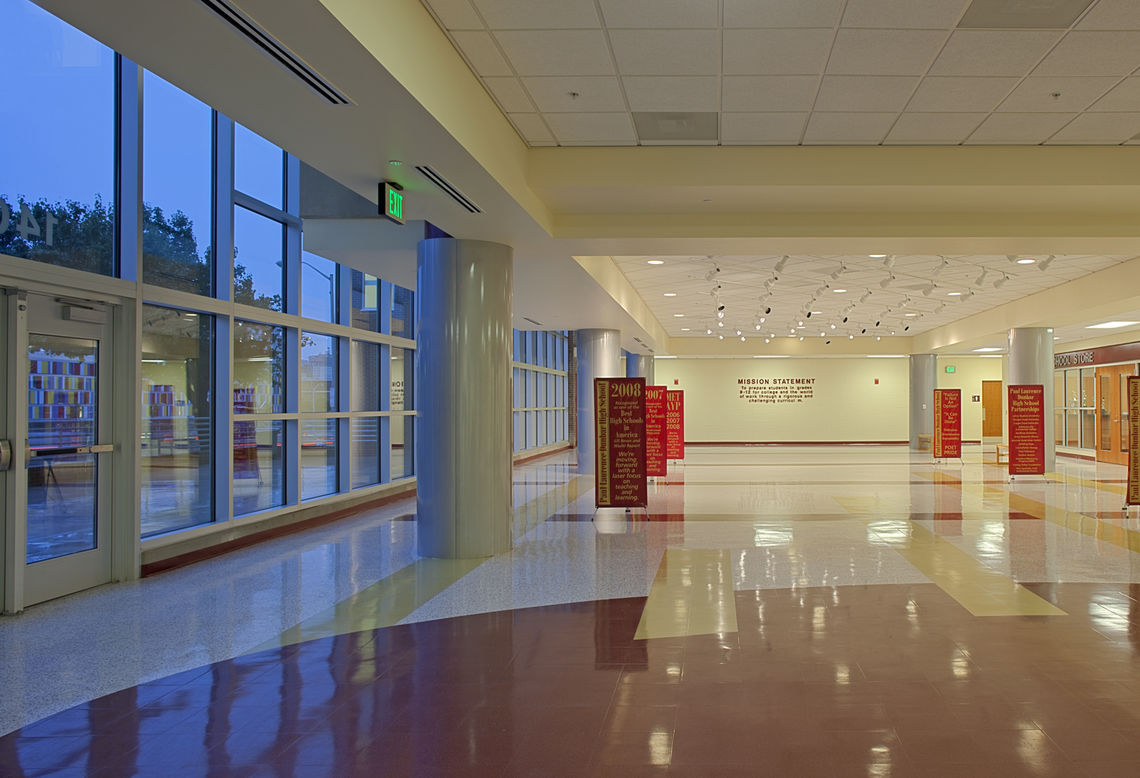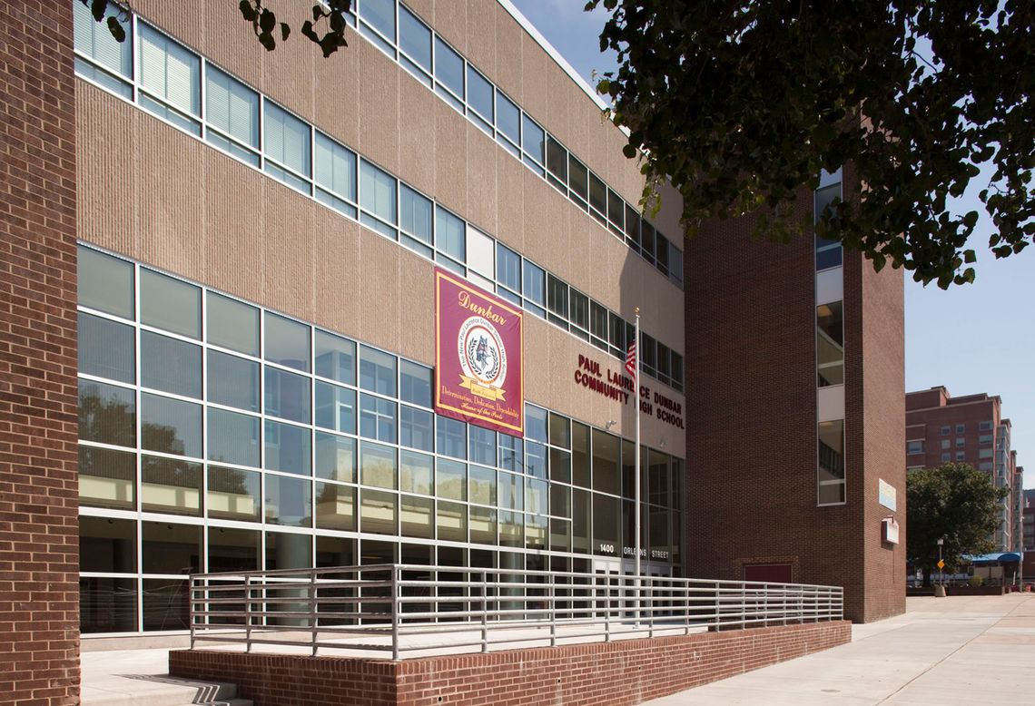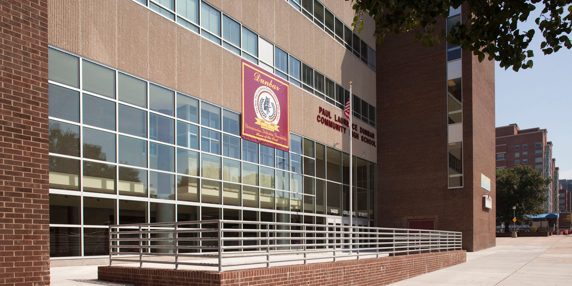 The lobby and redesigned façade give the school a new visible and welcoming entry, which the building had always lacked. Instead of a dark area in a breezeway beneath the school previously used for entry, students, staff, and visitors now access the building directly from Orleans Street and enter a light-filled space displaying school trophies and student artwork.
