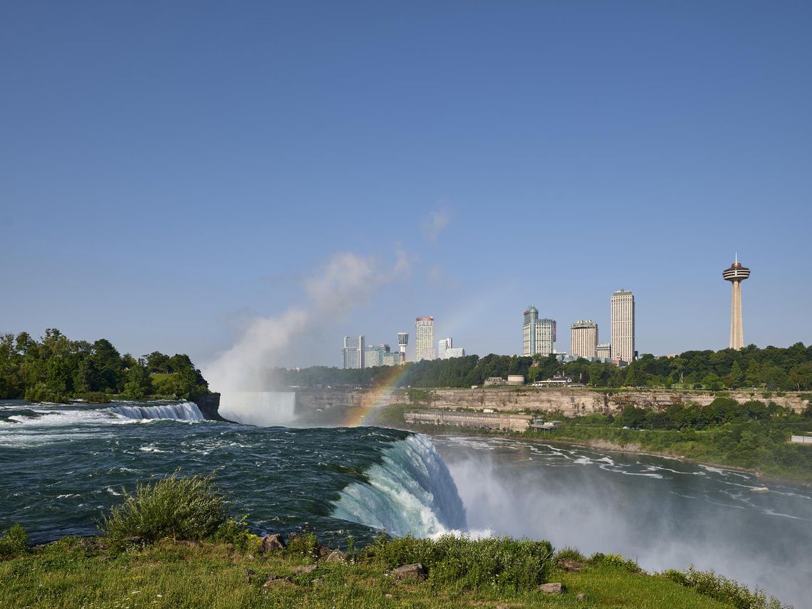Placing the awe-inspiring beauty of the Niagara River Gorge and immense power of the falls at the forefront, the center is a quiet form nestled into the landscape. The building frames views to the head of the falls and gracefully transitions visitors between the formal entrance gardens and the Frederick Law Olmsted-designed landscape of the lower grove. Like a giant sheet of water, the expansive glass facade maximizes views and offers continuous connections to the falls throughout the lobby and exhibit areas. Natural materials, including limestone sourced from the Niagara escarpment, wood ceilings, and blackened metal roof and soffit integrate the building with its site and history.