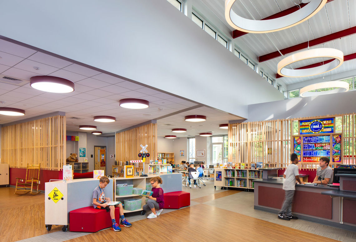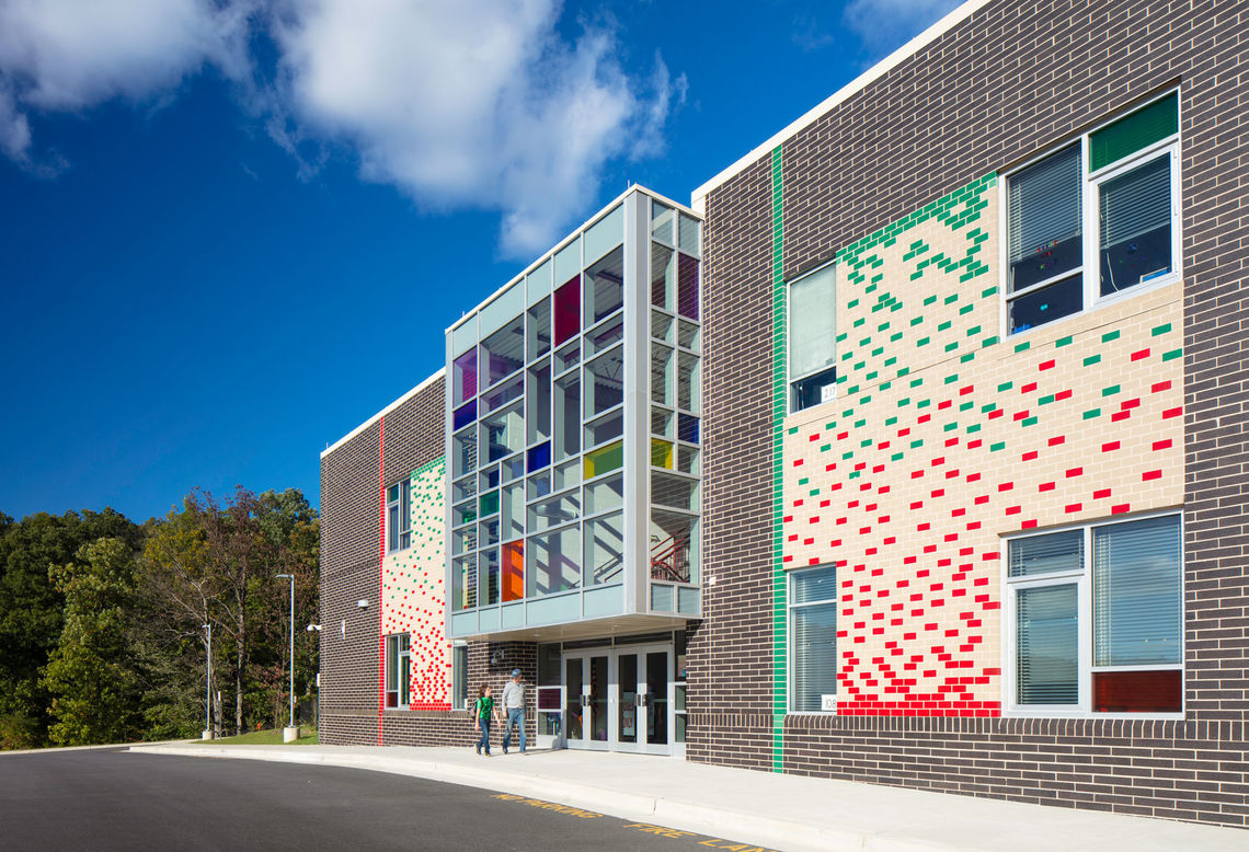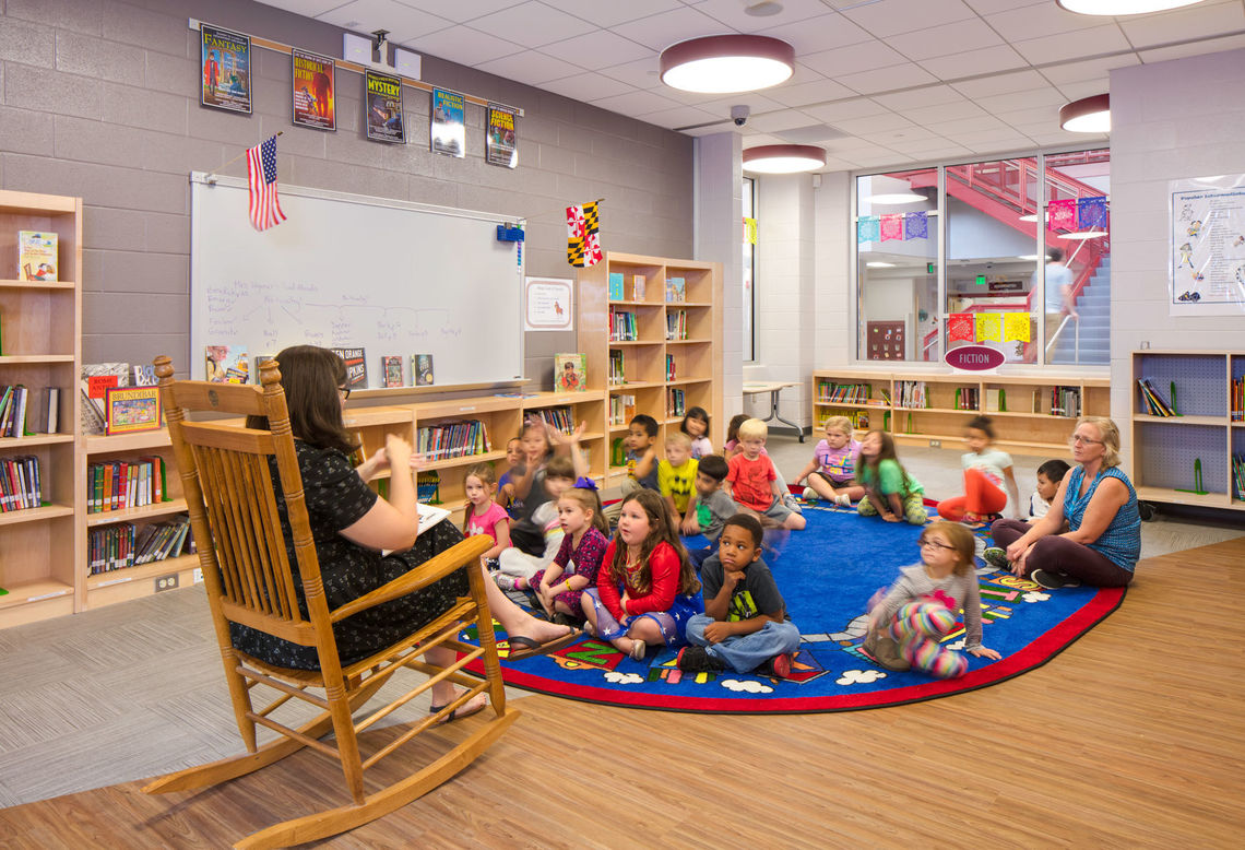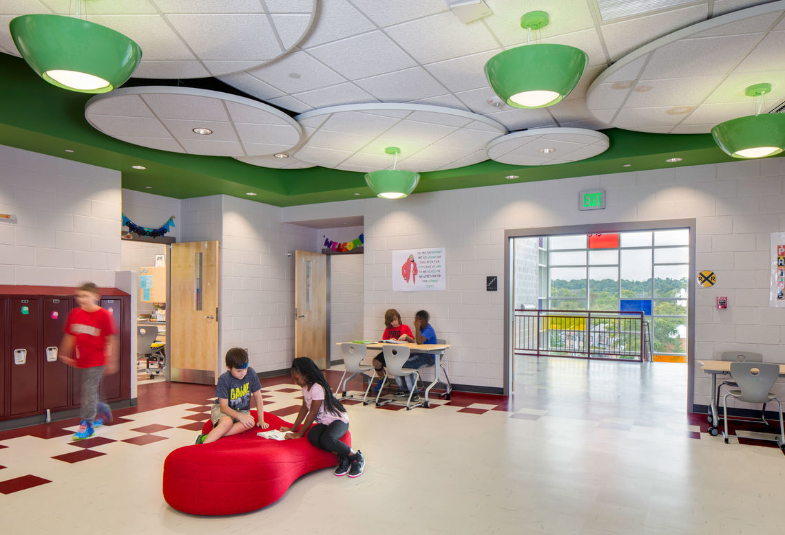 A focus on collaboration, community, flexibility, and identity led the design of the new Relay Elementary School. Organized into grade-level neighborhoods, communities of learners and teachers are created within the central commons space, a flexible and open area for differentiated instruction and problem-based learning. Neighborhoods are delineated by interior and exterior color selections—one color for each grade level—to enhance student wayfinding and promote a sense of identity.