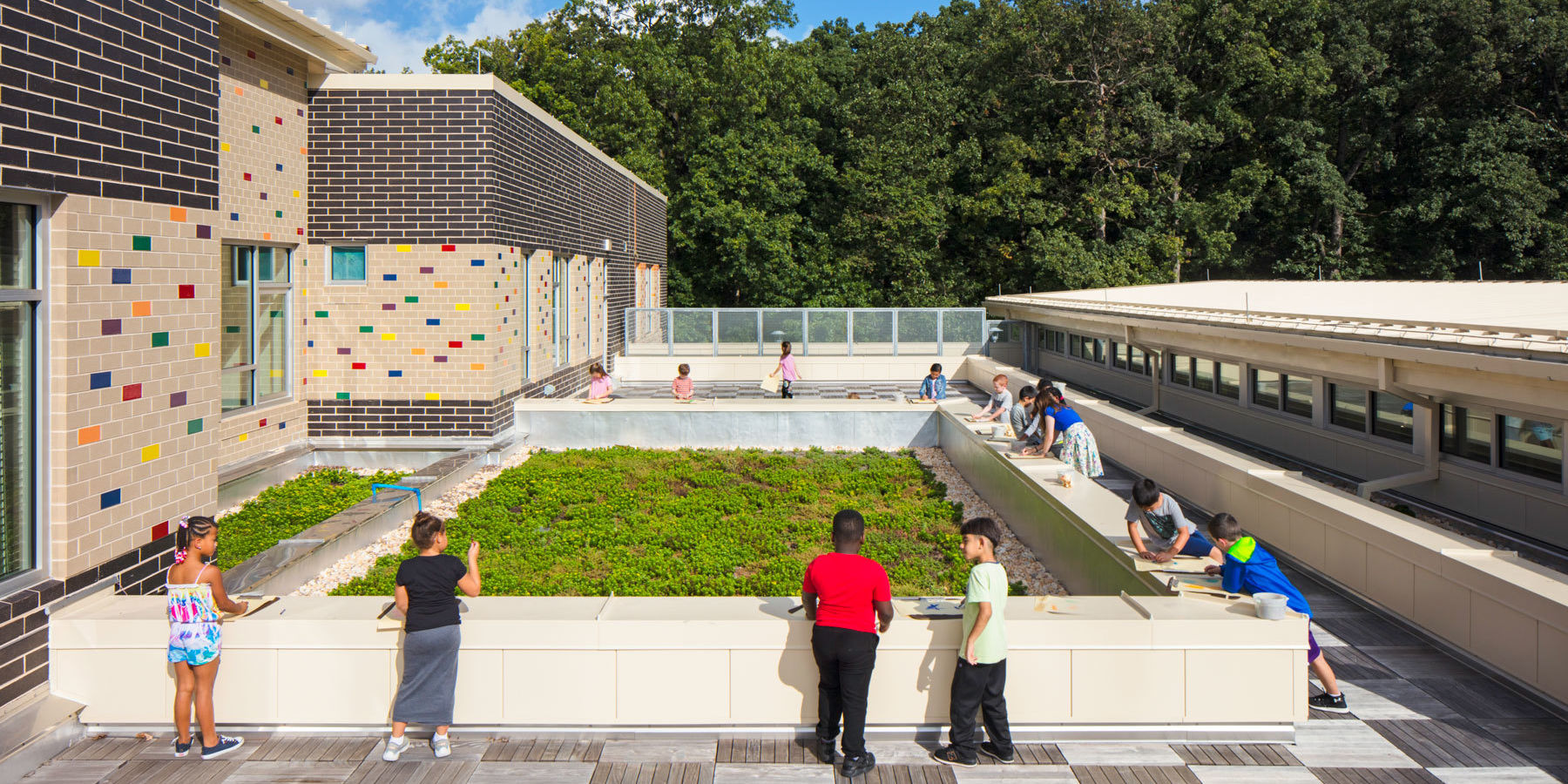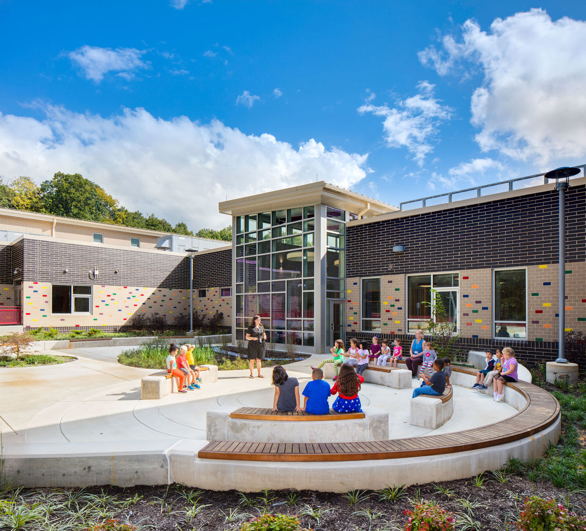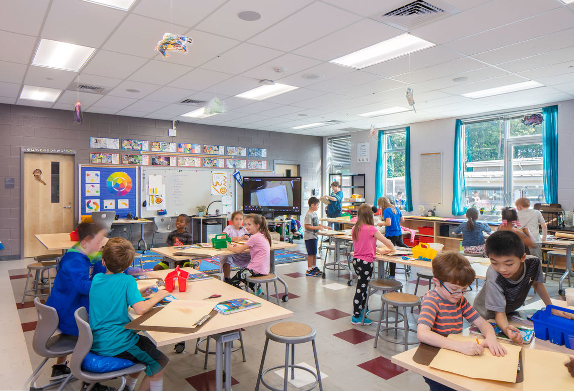 A focus on collaboration, community, flexibility, and identity led the design of the new Relay Elementary School. Organized into grade-level neighborhoods, communities of learners and teachers are created within the central commons space, a flexible and open area for differentiated instruction and problem-based learning. Neighborhoods are delineated by interior and exterior color selections—one color for each grade level—to enhance student wayfinding and promote a sense of identity.