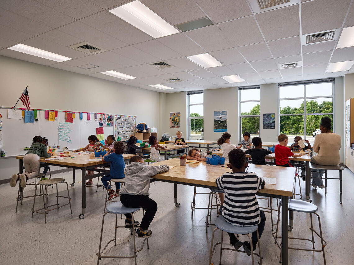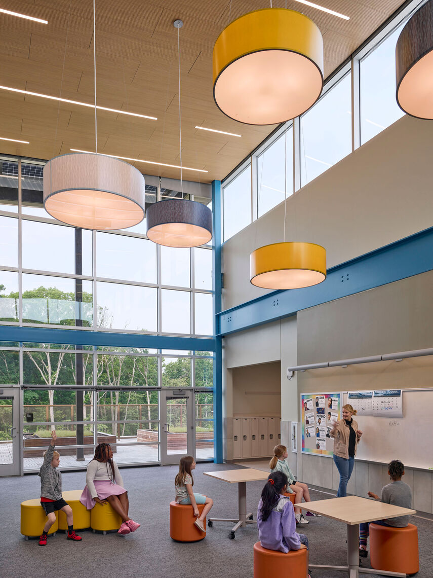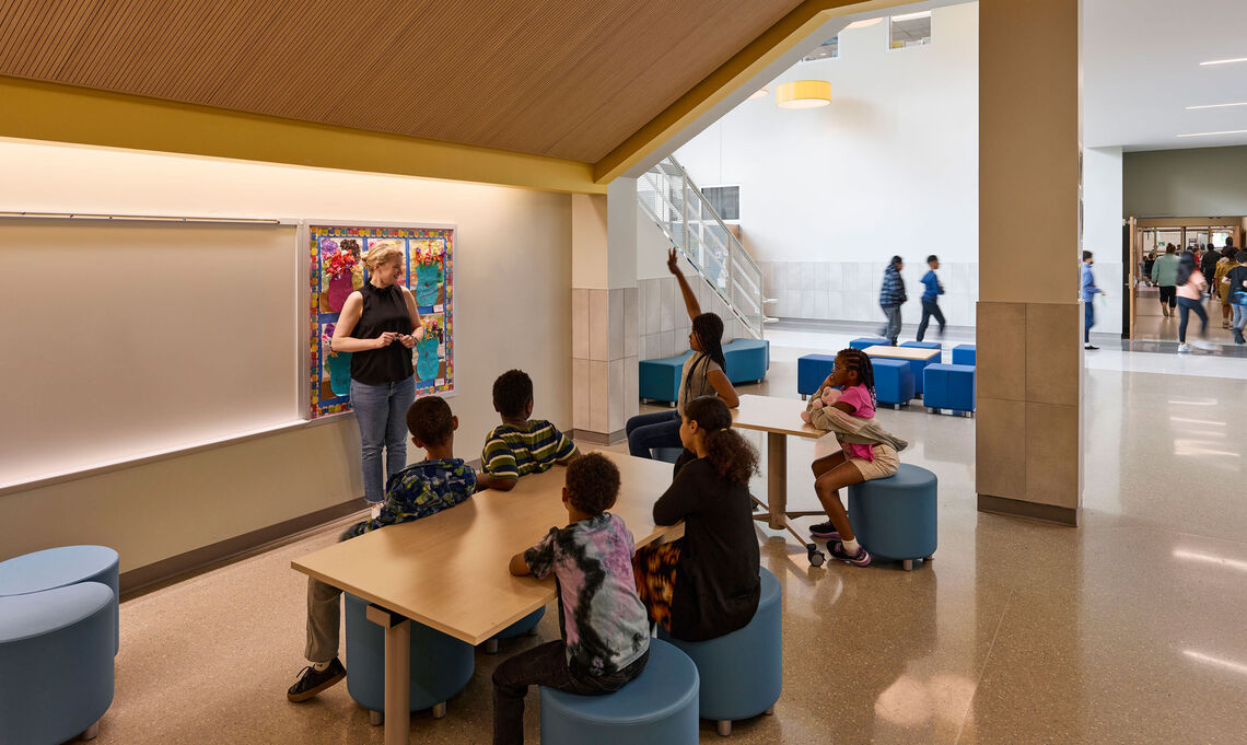 Comprised of a classroom wing and a cafeteria/gymnasium wing connected by the core of the building, the new 21st century school provides numerous possibilities for collaborative learning. The two-story classroom wing is organized around a large learning commons on each floor, providing space for multimodal instruction. Pairs of classrooms also share smaller breakout areas for out-of-class learning. Circulation areas also serve as informal learning spaces, such as the multipurpose main stair, which can be used for presentations or performances and provide additional opportunities underneath for art displays and small-group teaching space.