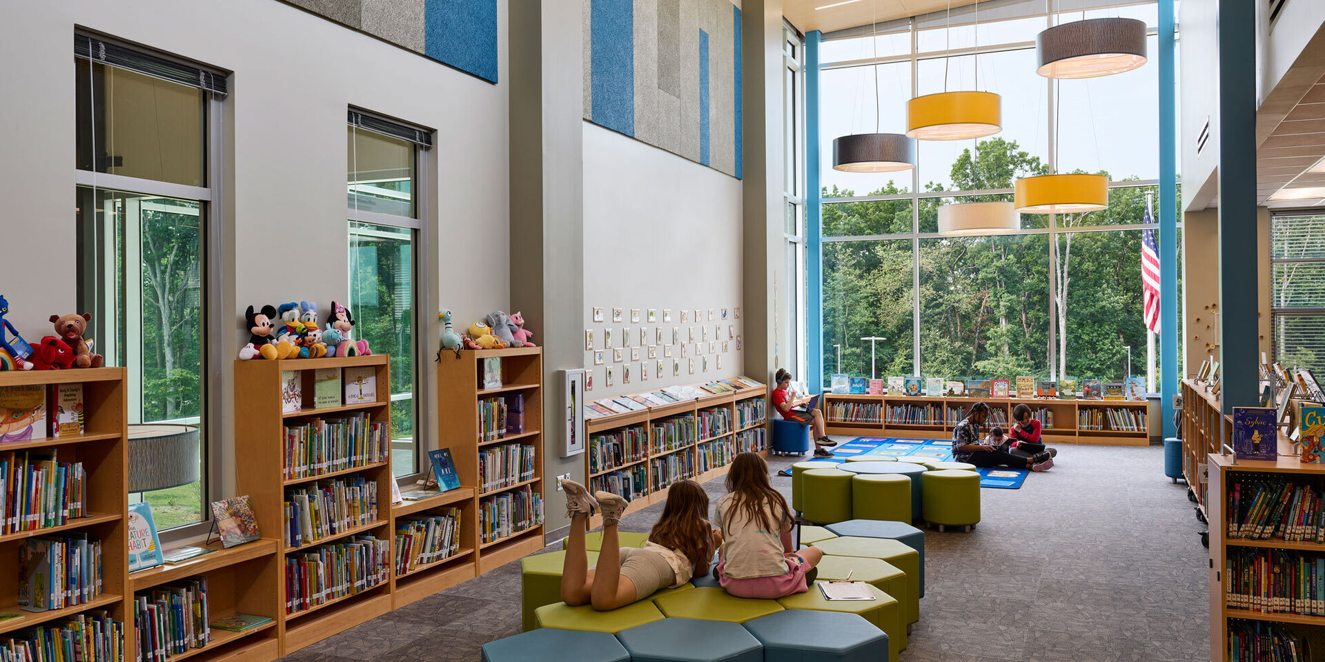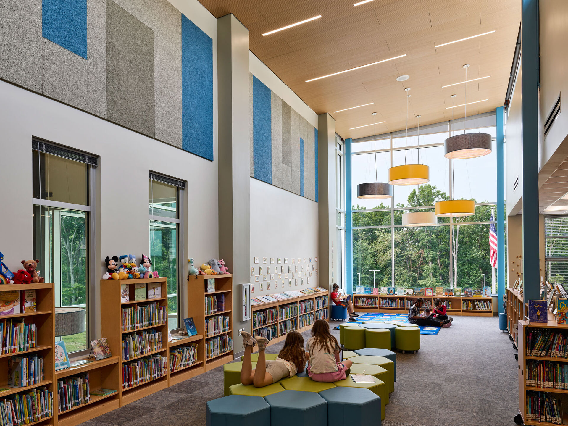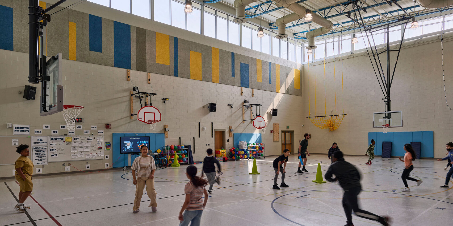 Comprised of a classroom wing and a cafeteria/gymnasium wing connected by the core of the building, the new 21st century school provides numerous possibilities for collaborative learning. The two-story classroom wing is organized around a large learning commons on each floor, providing space for multimodal instruction. Pairs of classrooms also share smaller breakout areas for out-of-class learning. Circulation areas also serve as informal learning spaces, such as the multipurpose main stair, which can be used for presentations or performances and provide additional opportunities underneath for art displays and small-group teaching space.