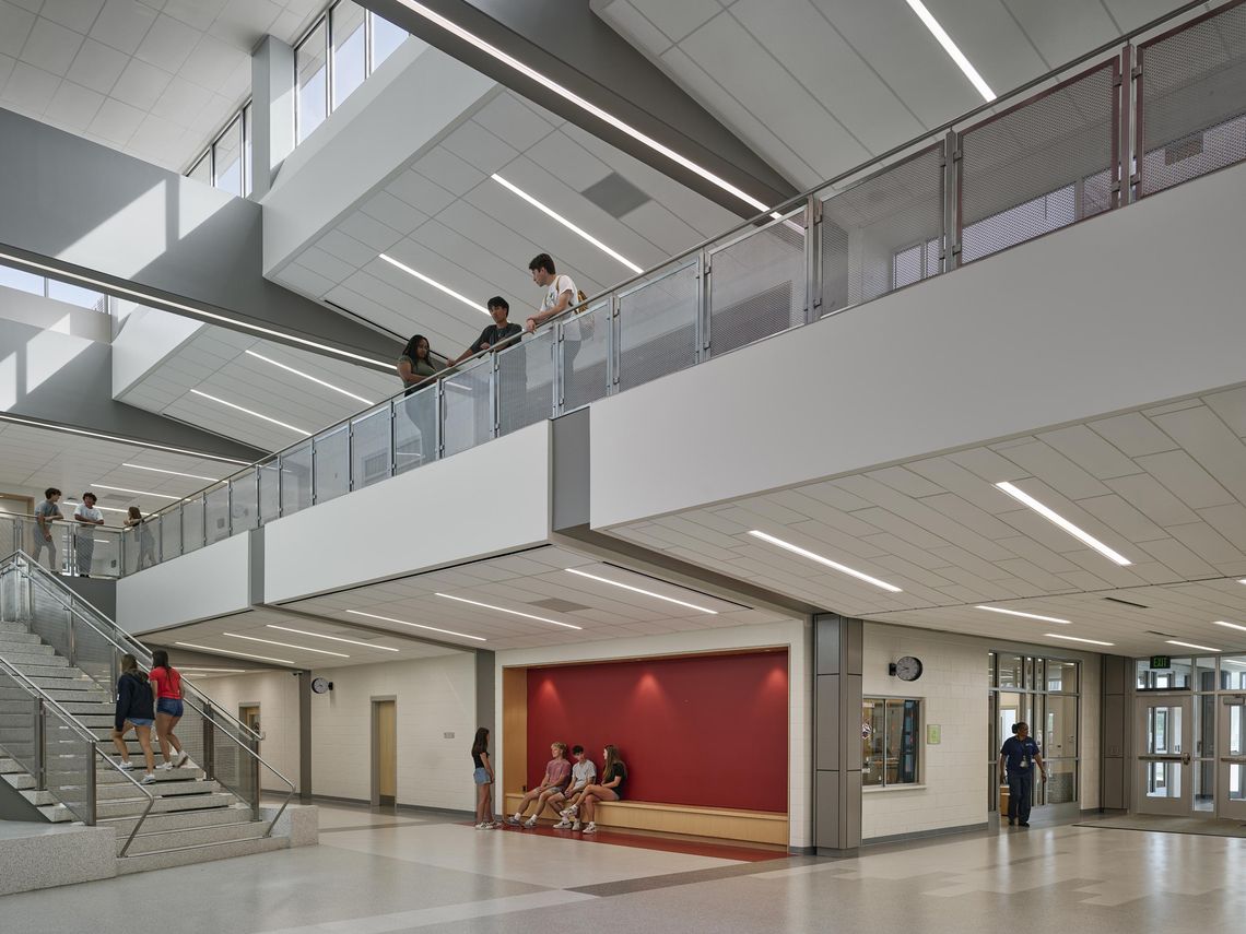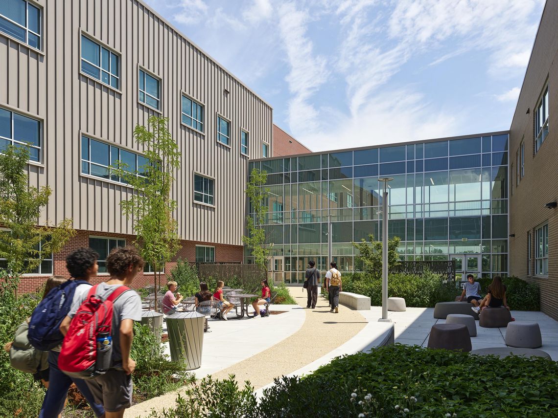 Core instructional programs are thoughtfully organized within a three-story academic bar to provide maximum daylight and ventilation. Flexible classrooms available for group and independent study are centrally located within the academic core to promote frequent use among students and faculty. Two glazed curtainwall corridors link the academic bar to the main building housing the media center, gymnasium, cafeteria, and administration. Benches within the corridors and adjacent to classrooms promote accidental collisions that foster interaction between students and faculty. An outdoor courtyard formed by the corridors offers students and teachers a place to learn, gather, and study.