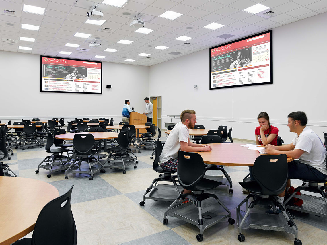 Originally home to a theater, Tawes Hall had stood vacant on the UMCP campus for more than a decade. This project reimagined the building, inserting two levels of modern learning spaces in the former auditorium and offices for the university’s Department of American Studies in the theater’s fly tower. Removing a portion of the tower’s exterior wall allowed the infusion of natural light into the four office levels created in the formerly dark 80-foot tower. Upper level views look across a rooftop terrace while light filters down through floor openings to the levels below. Program space is maximized for the university’s use and the once-dormant building today bustles with students who learn, gather, and circulate within the reinvented structure.