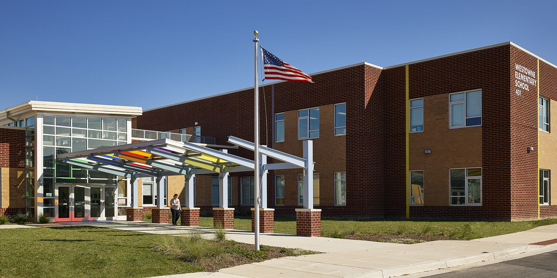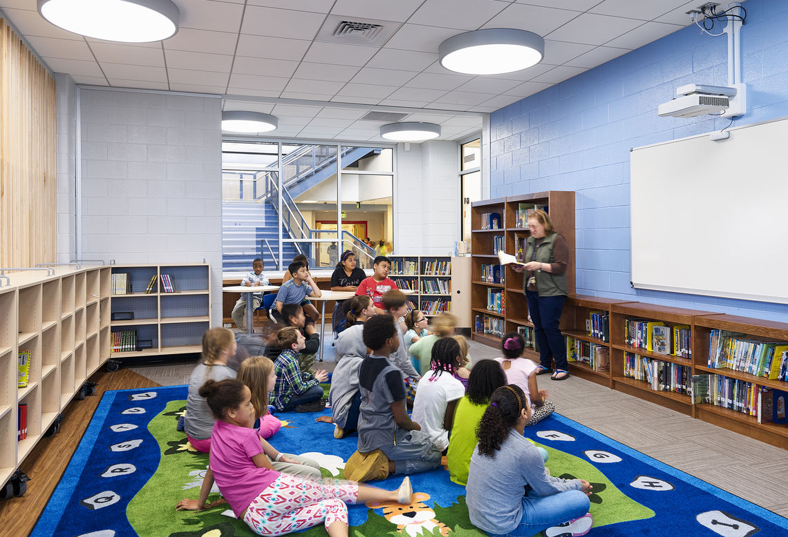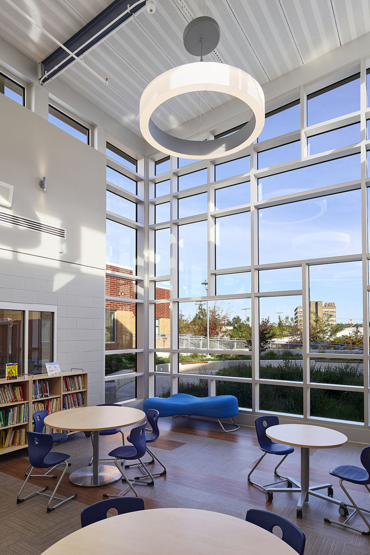 Interior and exterior color selections—one color for each grade level—help to foster a sense of identify and assists with student wayfinding. Expanses of glass and ample outdoor space continually bridge indoors and out. A light-filled media center with connecting outdoor reading garden along with a second-floor rooftop classroom offer differing mediums for learning and gathering.