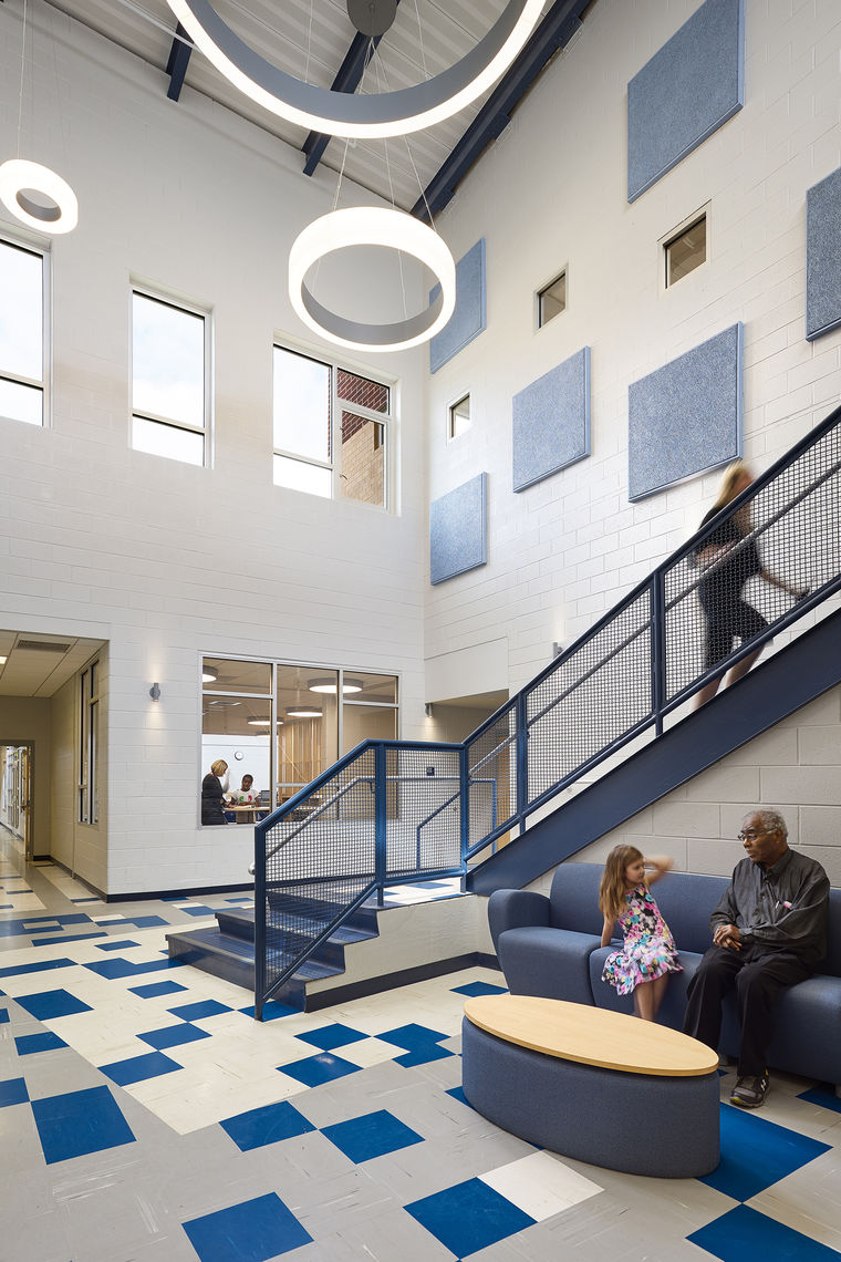 Communities of learners are created through a central organizing structure that features a collection of neighborhoods segmented by grade level. A central commons space within each grade cluster provides open and flexible areas for differentiated instruction and problem-based learning.
